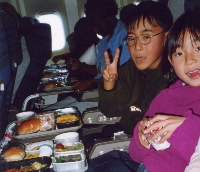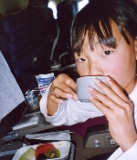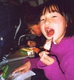 | 親としてはお上品に食べて欲しいんだけど・・・期待する方が無理だね。 真ん中のクラッシュアーモンドアイスは眠気さましにちょうどよく、美味しかった。 到着1時間前の軽食では500mlパック牛乳にビックリ、でも全部飲みました。 |