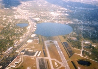 | やっとオーランド空港が見えたぁー ディズニーワールドはどこじゃぁ〜 上空からのオーランドはたくさんの池と森が見え、家が少ない。 |